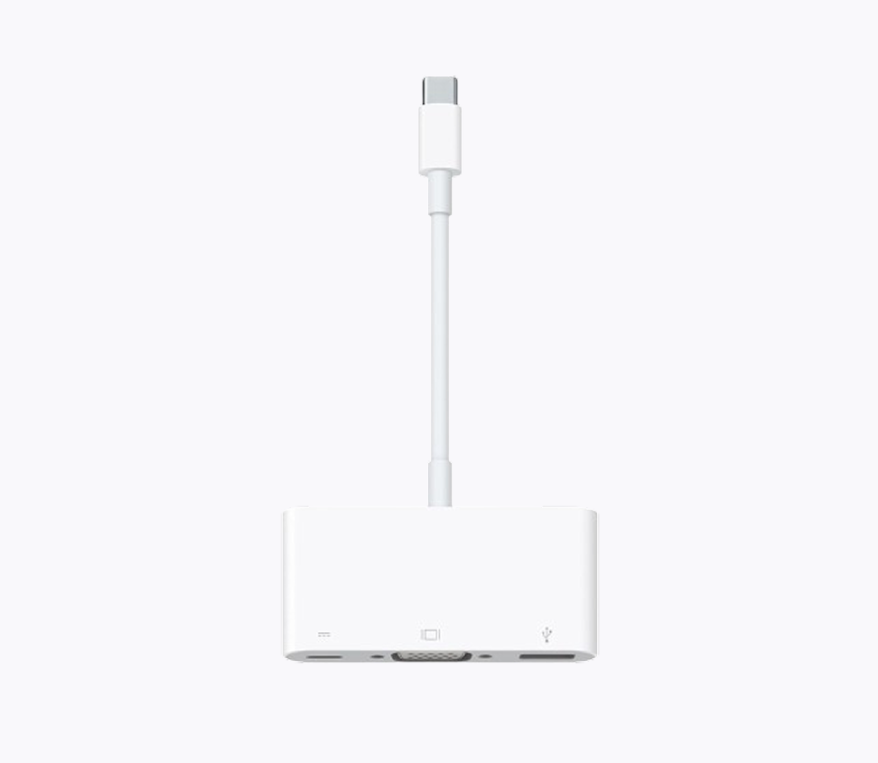 The Apple USB-C VGA Multiport Adapter lets you connect your Mac, iPad, or iPhone with USB-C to a VGA display, while also connecting a USB-A device and a USB-C charging cable. It supports video output up to 1080p and is ideal for presentations, video playback, or extended displays. Compact and easy to carry, it's a convenient all-in-one solution for work or travel.